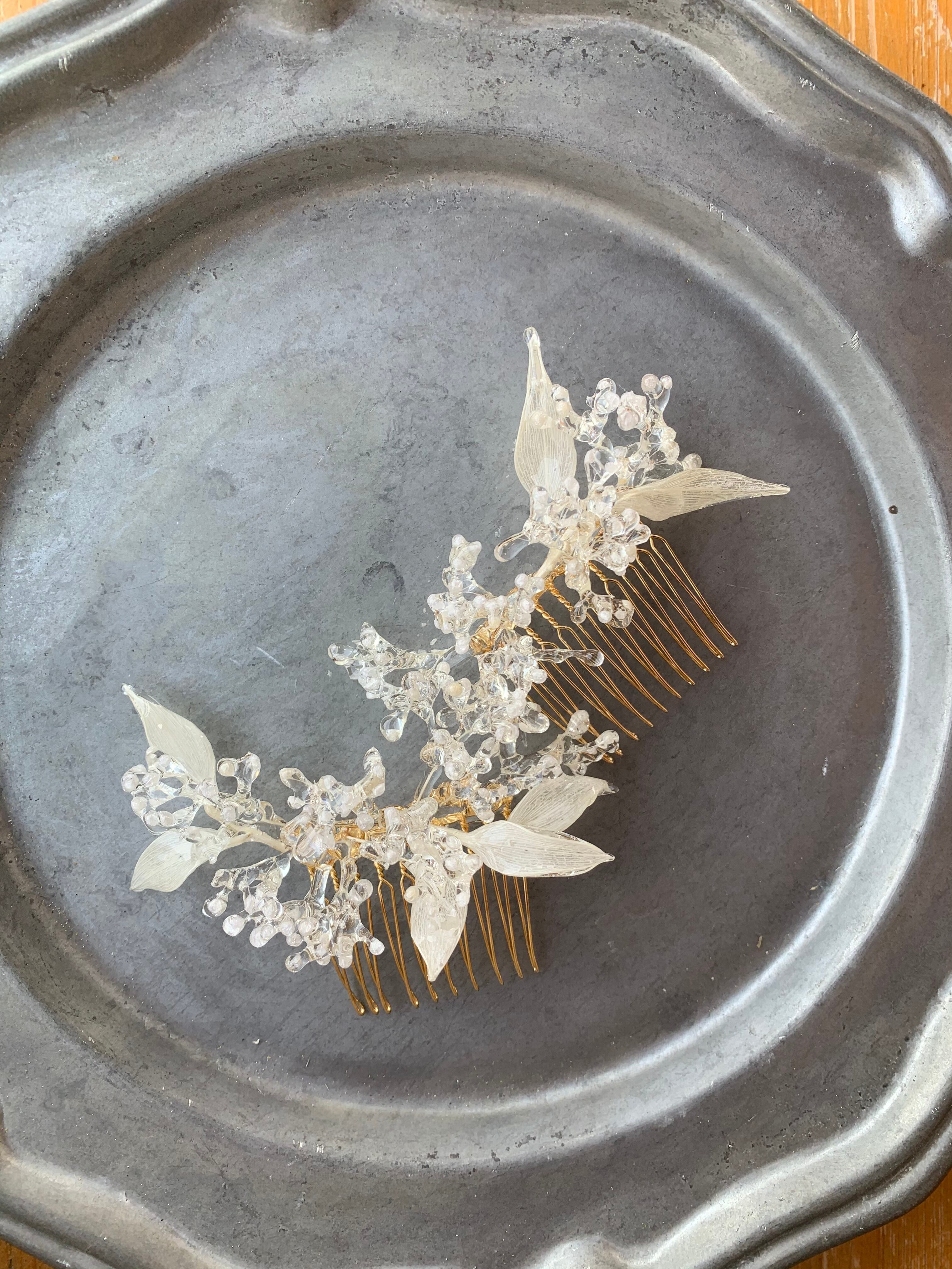 かすみ草と白リーフのヘアコームです。