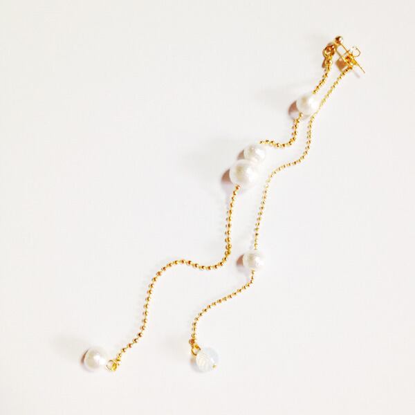 表面がカットされたボールチェーンはきらきらと光り、華奢さと華やかさをプラスしてくれます。ミルクパールのガラスビーズが一粒アクセントに。
