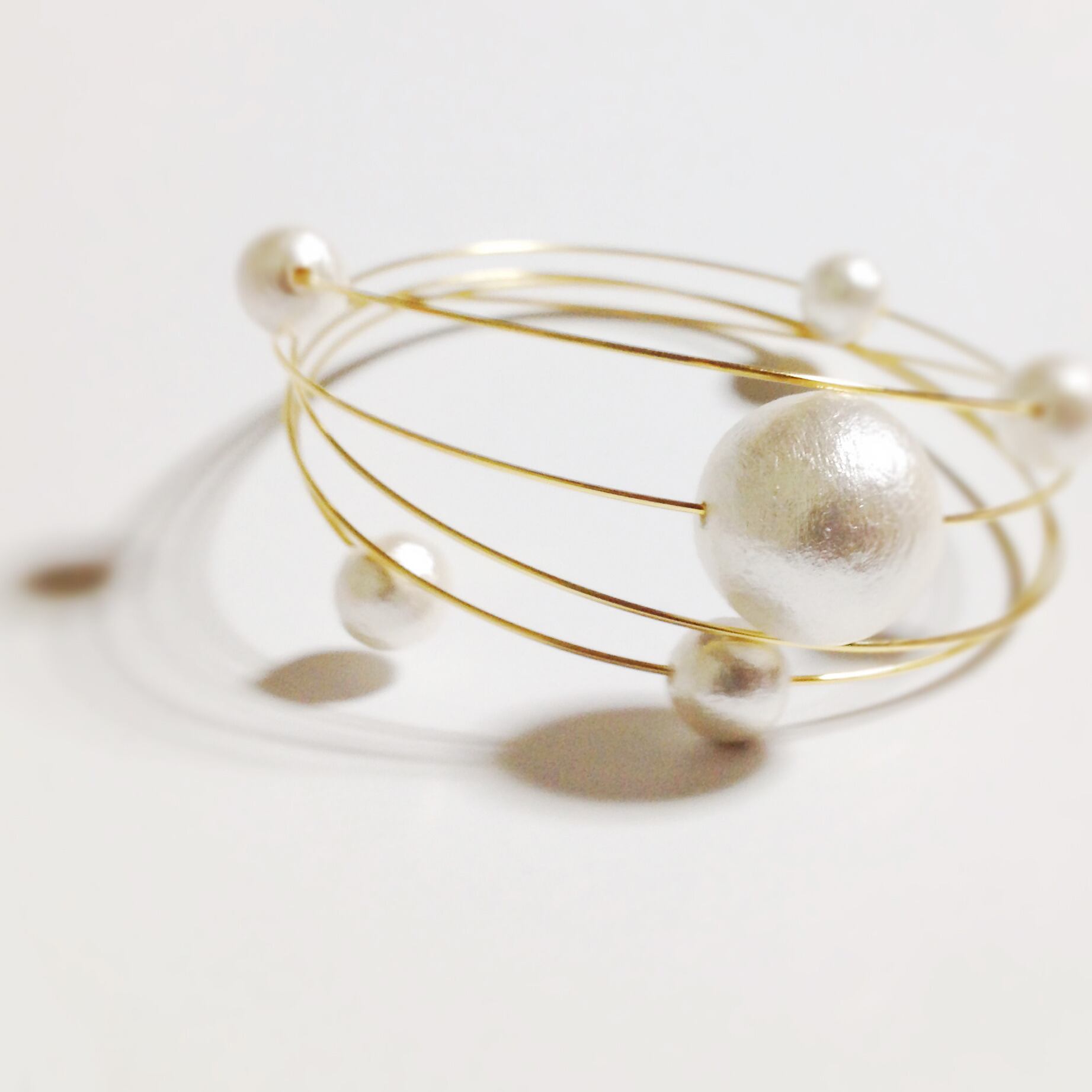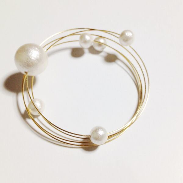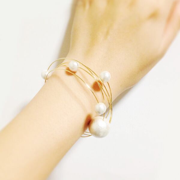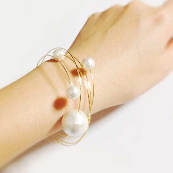 華奢な細身のワイヤーブレスレットにコットンパールが泡のようにぷくぷくと付いています。付け心地もまるで泡のように軽いです。
